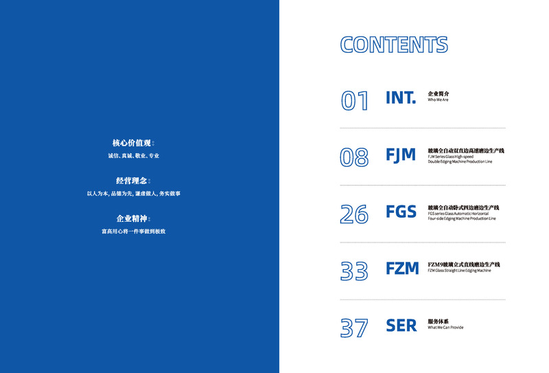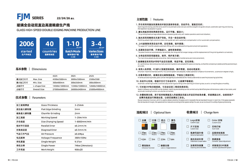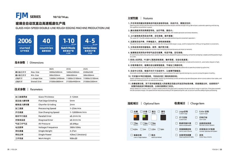 富高成立於 2004 年,原名:佛山市順德區富高玻璃機械有限公司,經品牌優化升級,自2020年起,更名為:廣東富高智能科技有限公司。用心做品牌,全心為客戶:十八年的沈澱,創新、品質和服務已經成為根植於富高血液中的文化。以初心、洞察、思考、實踐,去發掘可能、解決問題、為客戶創造價值,永遠是富高前行的目標與方向。 自成立以來,秉承著為玻璃深加工行業創造更多可能的企業使命,致力於研發、設計玻璃智能高速磨邊生產線項目:玻璃全自動雙直邊高速磨邊生產線和玻璃全自動臥式四邊磨機生產線,並建立起完善的銷售和服務體系。我們的產品遠銷美國、中東、俄羅斯、南美、韓國、墨西哥等超過 60 個國家及地區。 未來,富高將繼續為您打造性能卓越、品質上乘、體驗非法的產品,與您一起發展,一起成長。